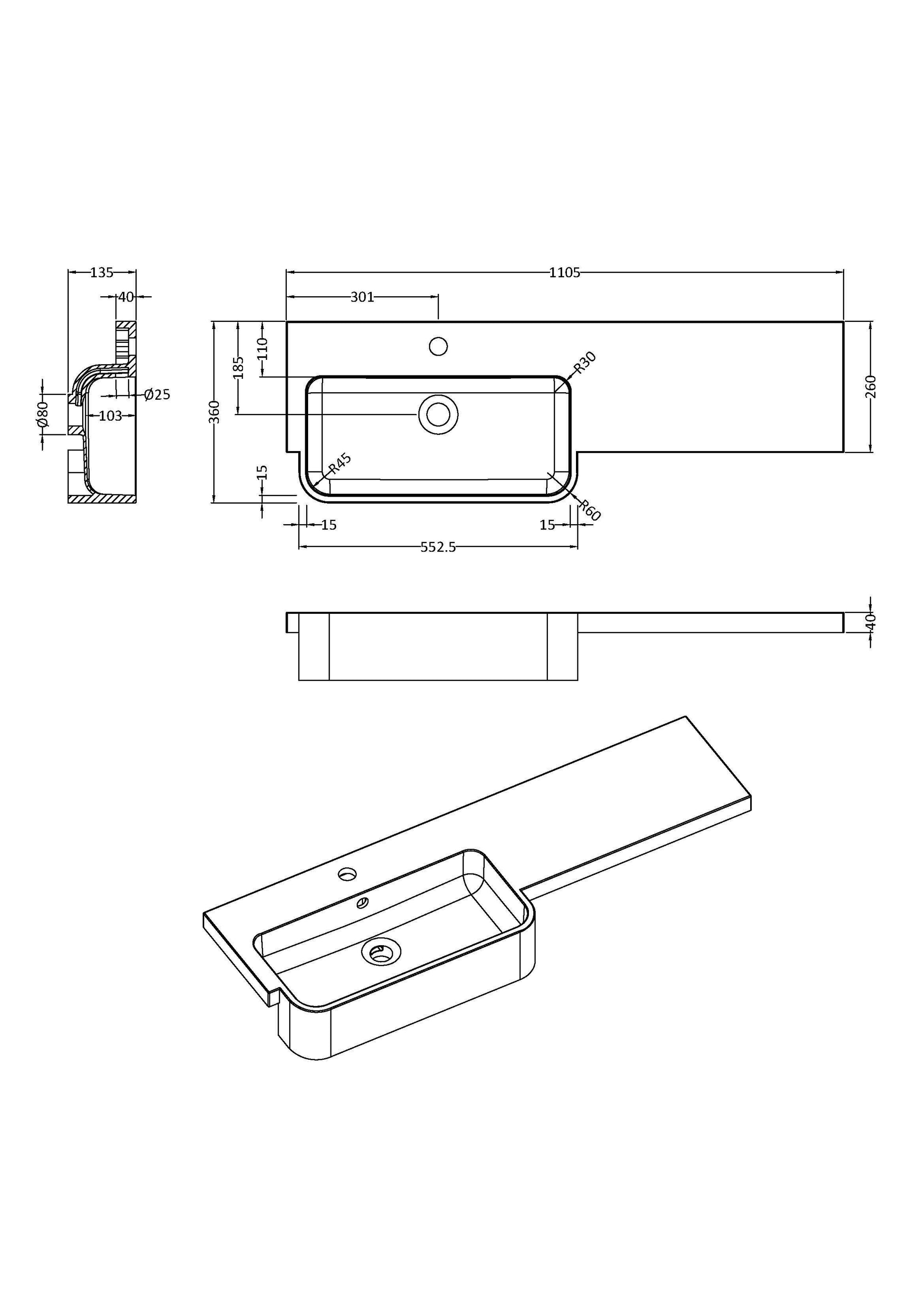 1100mm Round Semi-recessed Polymarble Basin - Left Hand