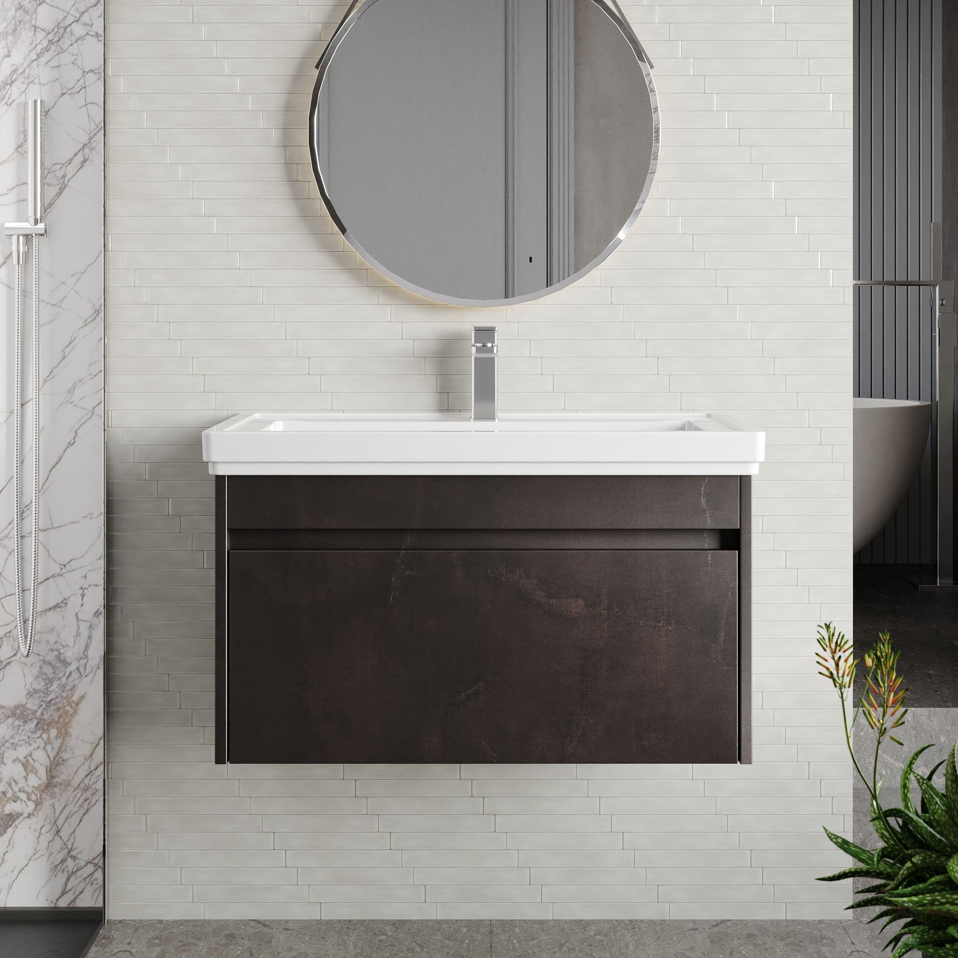 BC Designs Loftwood 800mm 1 Drawer Metallic Slate Wall Hung Vanity Unit With 1 Tap Hole Fireclay Basin