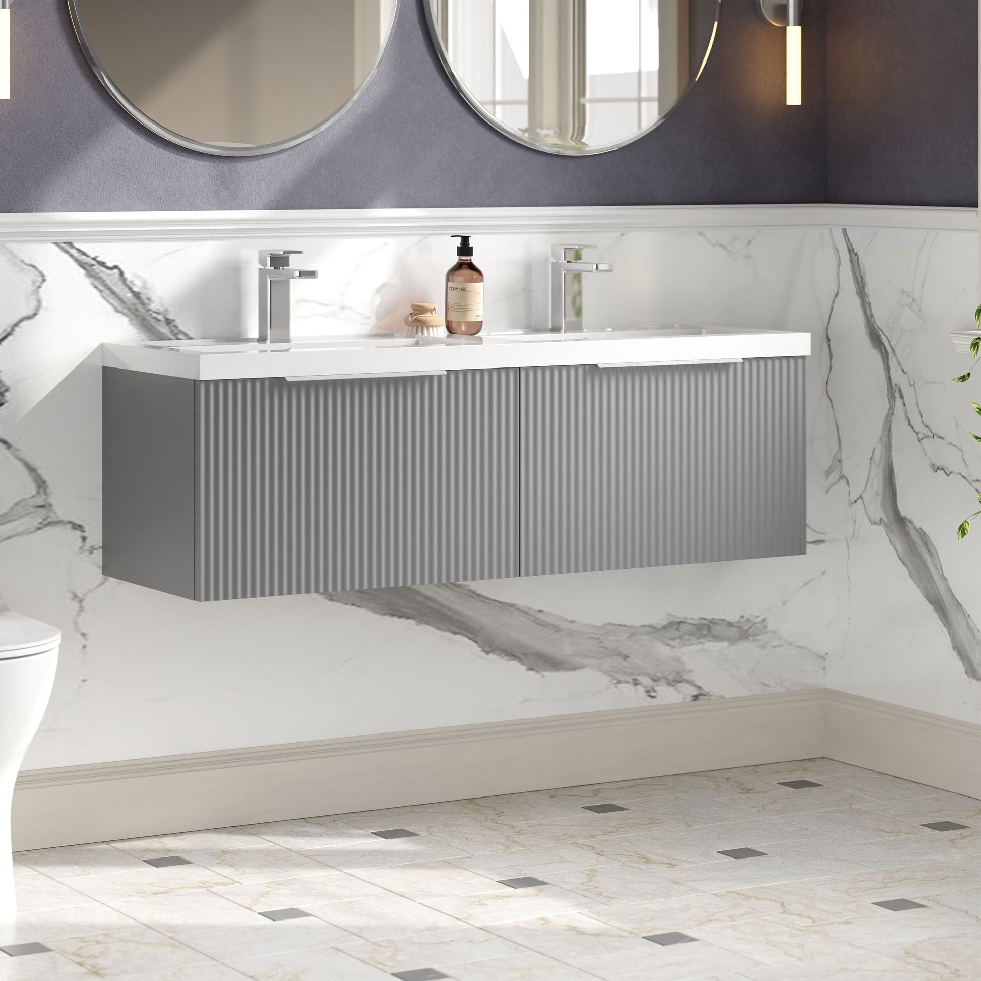 Refined, spacious, and modern, this satin grey fluted wall hung vanity unit features a double polymarble basin and two soft close drawers for a stylish shared bathroom solution.