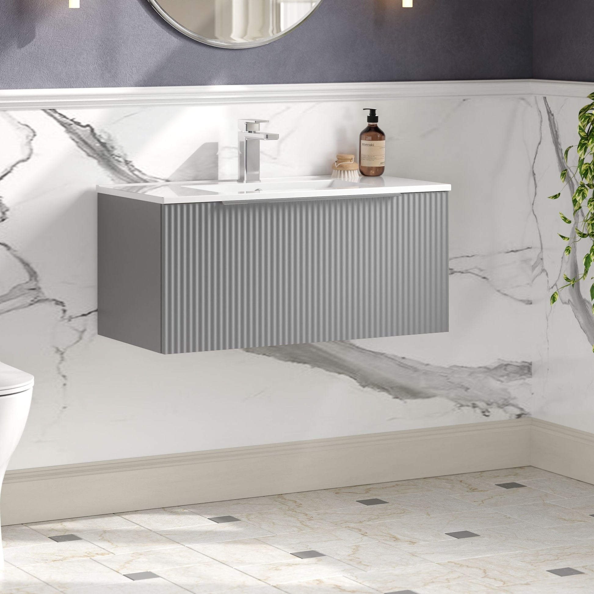 Hudson Reed Fluted 800mm Wall Hung Single Drawer Vanity and Minimalist Basin - Satin Grey