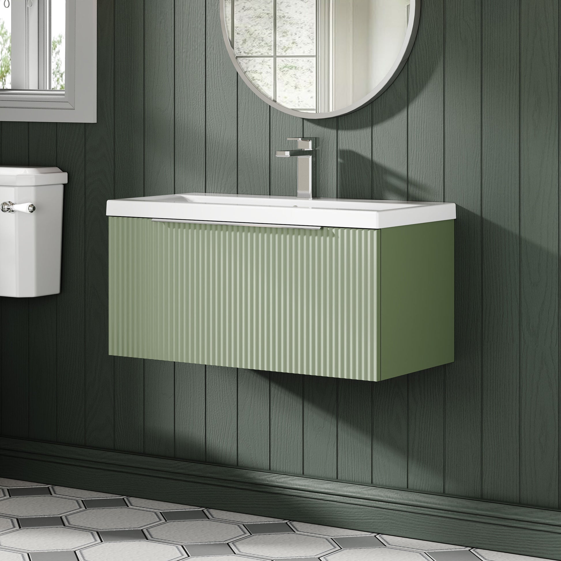 Balterley 800mm Fluted Wall Hung 1 Drawer Vanity with Ceramic Basin - Satin Green