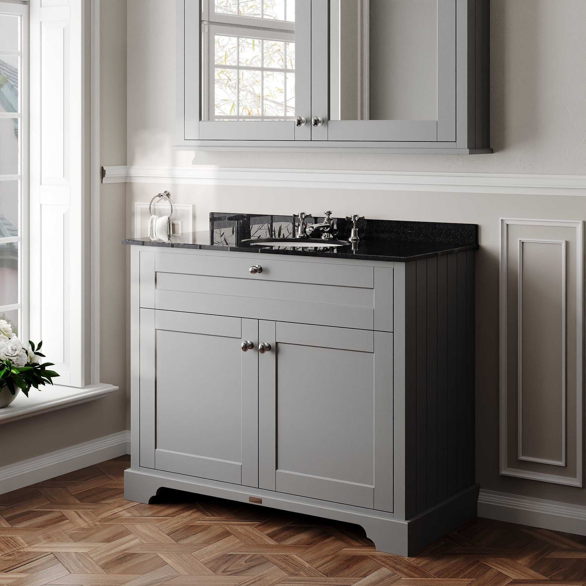 Hudson Reed Old London 1000mm Storm Grey Floor Standing 2 Door Vanity Unit With 3 Tap Hole Black Marble Top Basin