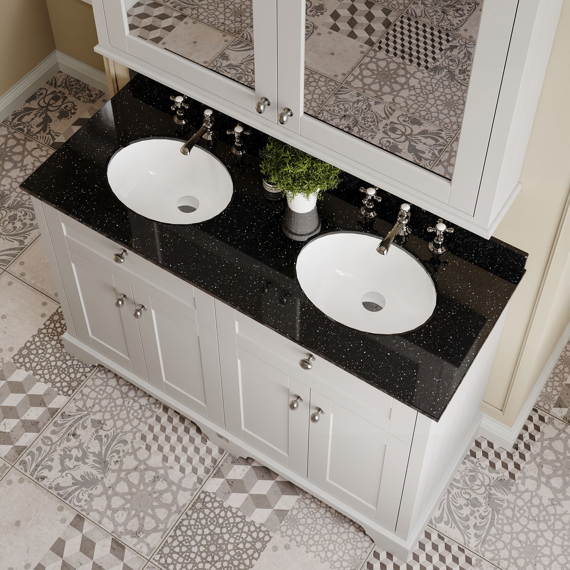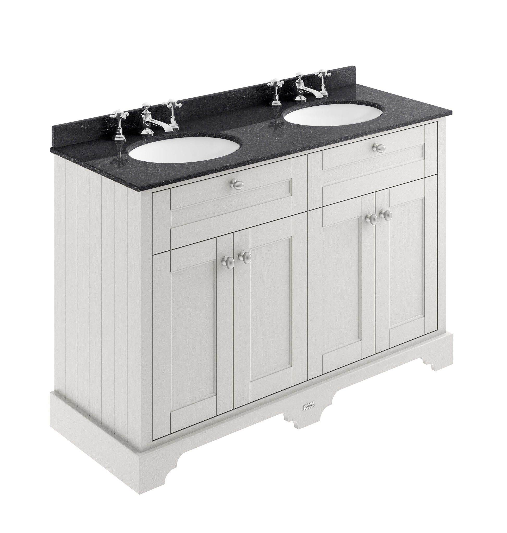 Old London Floor Standing 4 Door Vanity Unit with 3 Tap Hole Double Basin Black Marble Top 1200mm - Timeless Sand