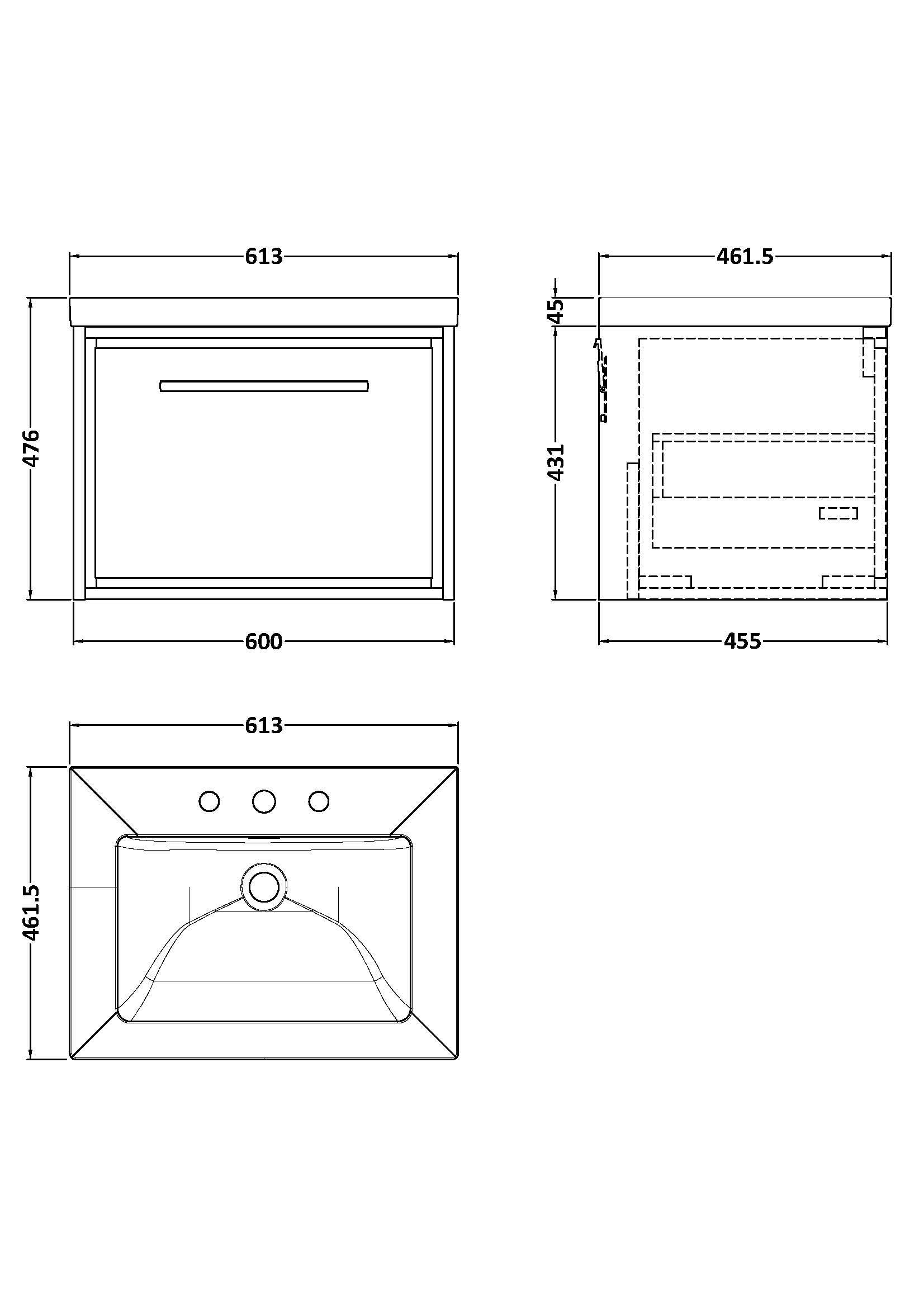 Lille 600mm Wall Hung Single Drawer Vanity with Basin - 3 Tap Hole
