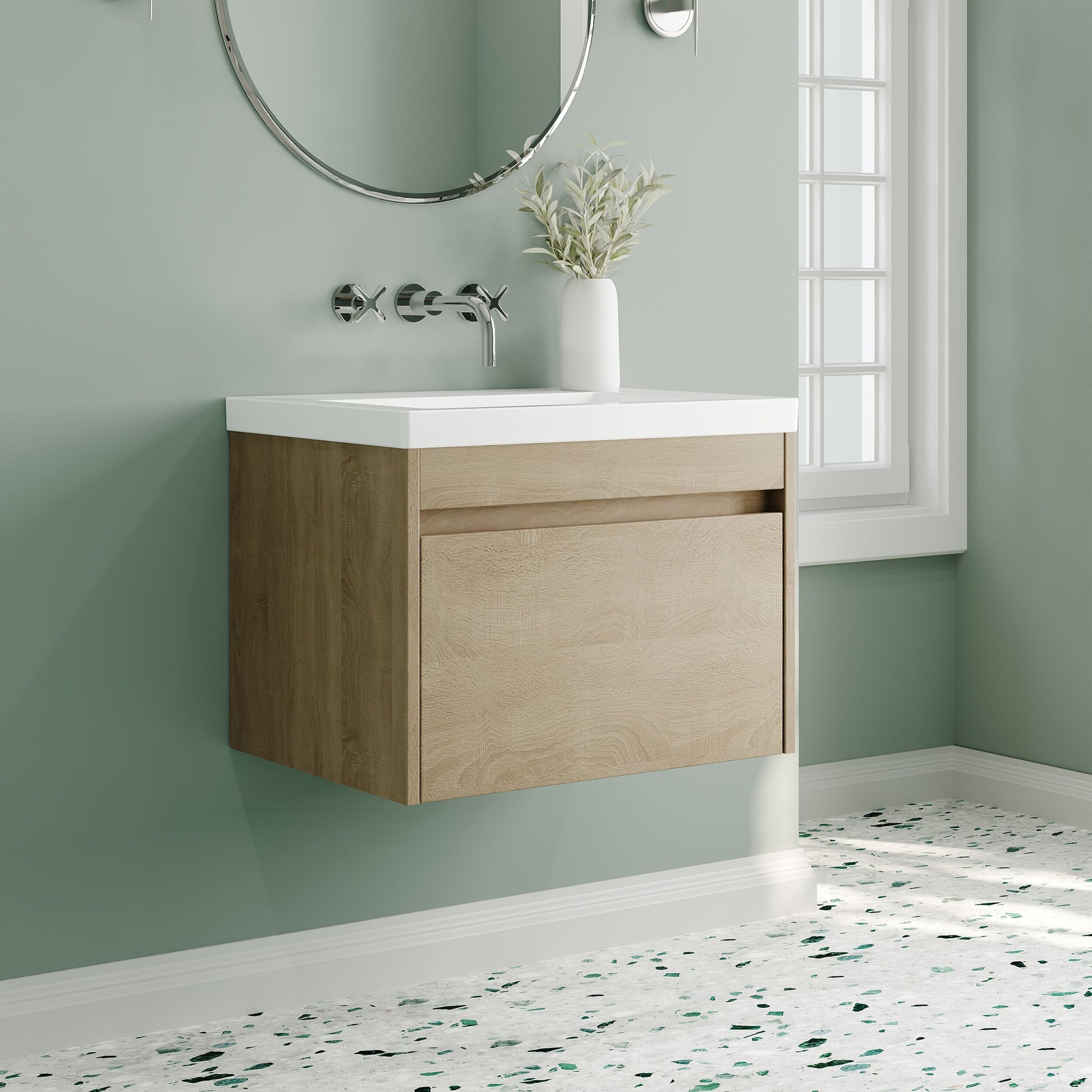 nuie Lux Loftwood 600mm Wall Hung 1 Drawer Unit and 0 Tap Hole Contemporary Basin - Bleached Oak
