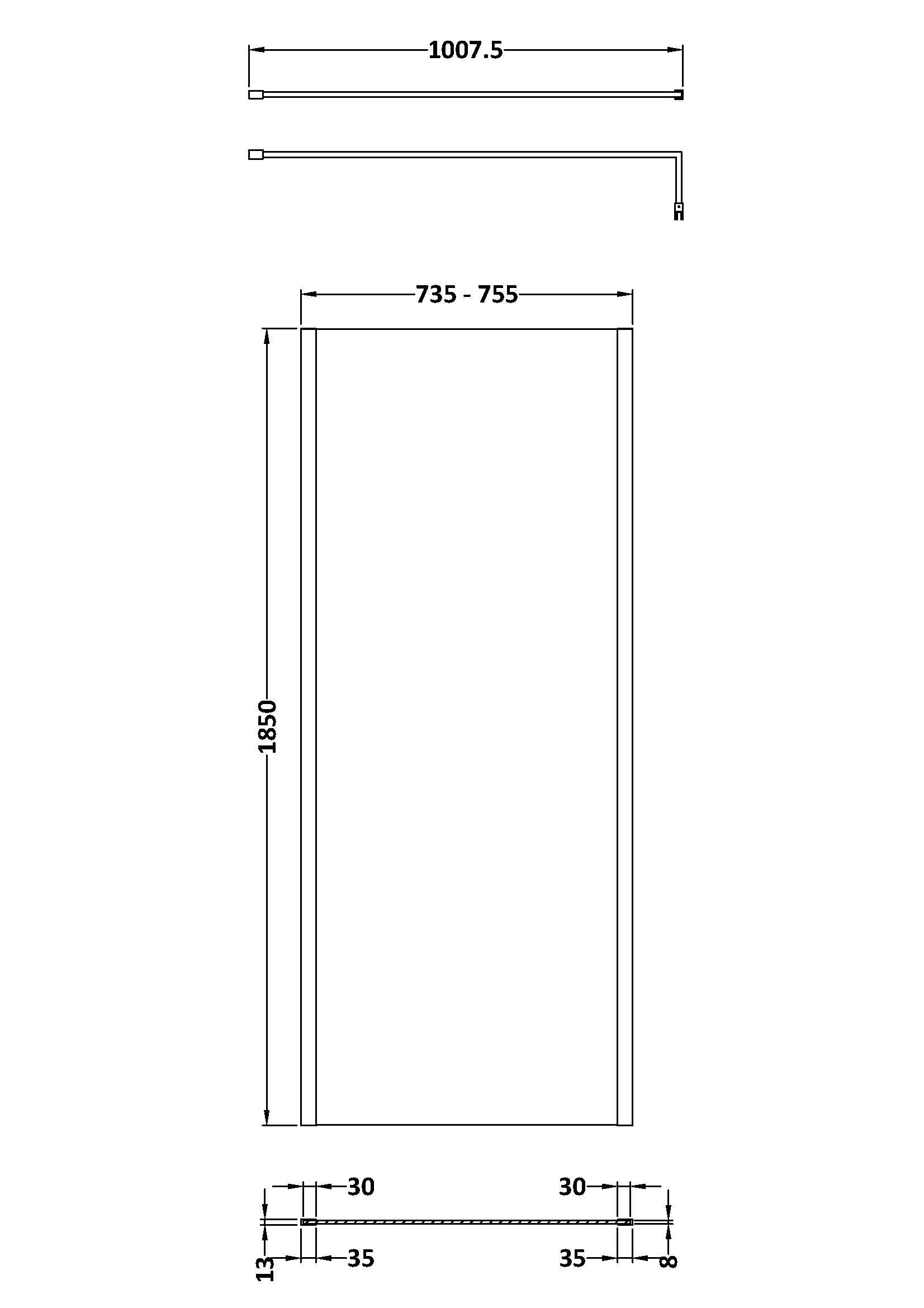 nuie 760mm Outer Framed Wetroom Screen with Support Bar - 8mm Glass - Matt Black