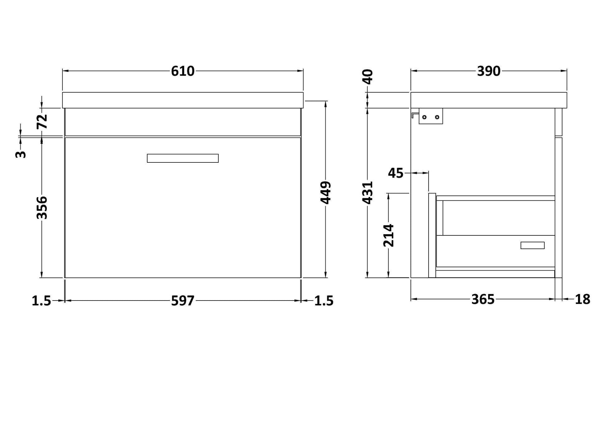 Nuie Athena 600mm Wall Hung Vanity Unit With Basin and Handle