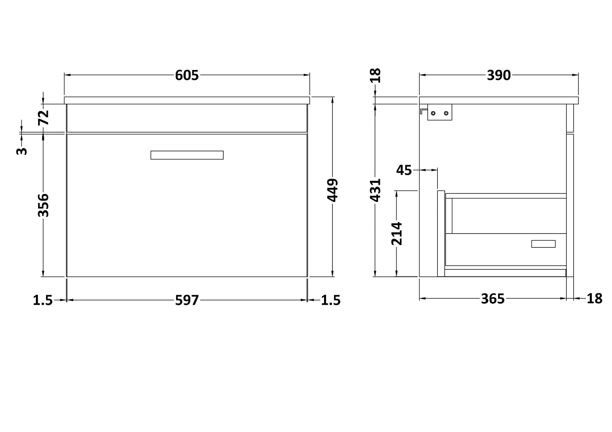 nuie Athena Wall Hung Single Drawer Vanity With Worktop 600mm - Gloss Grey