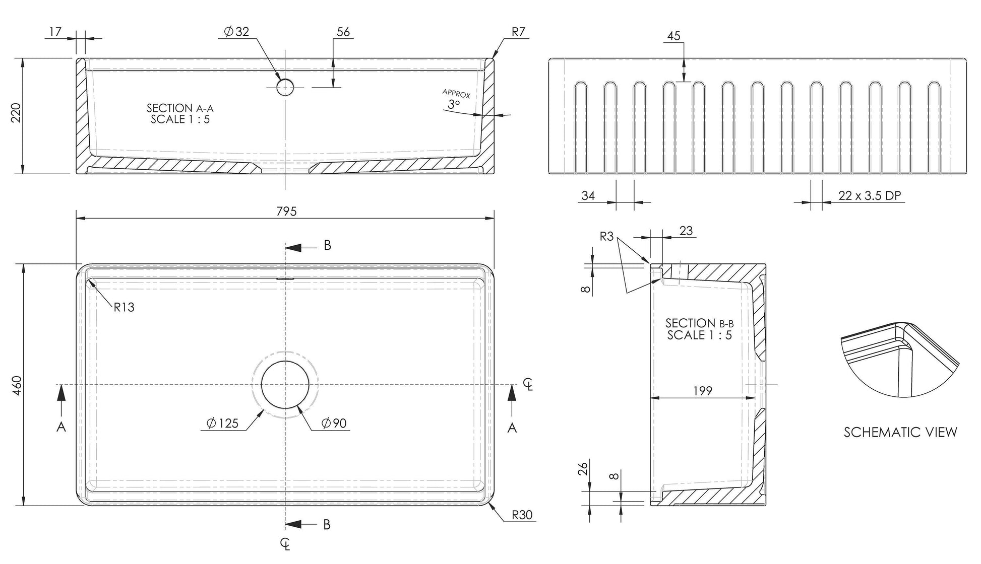 nuie Butler Sink with Ledge 795 x 460 x 220mm - White