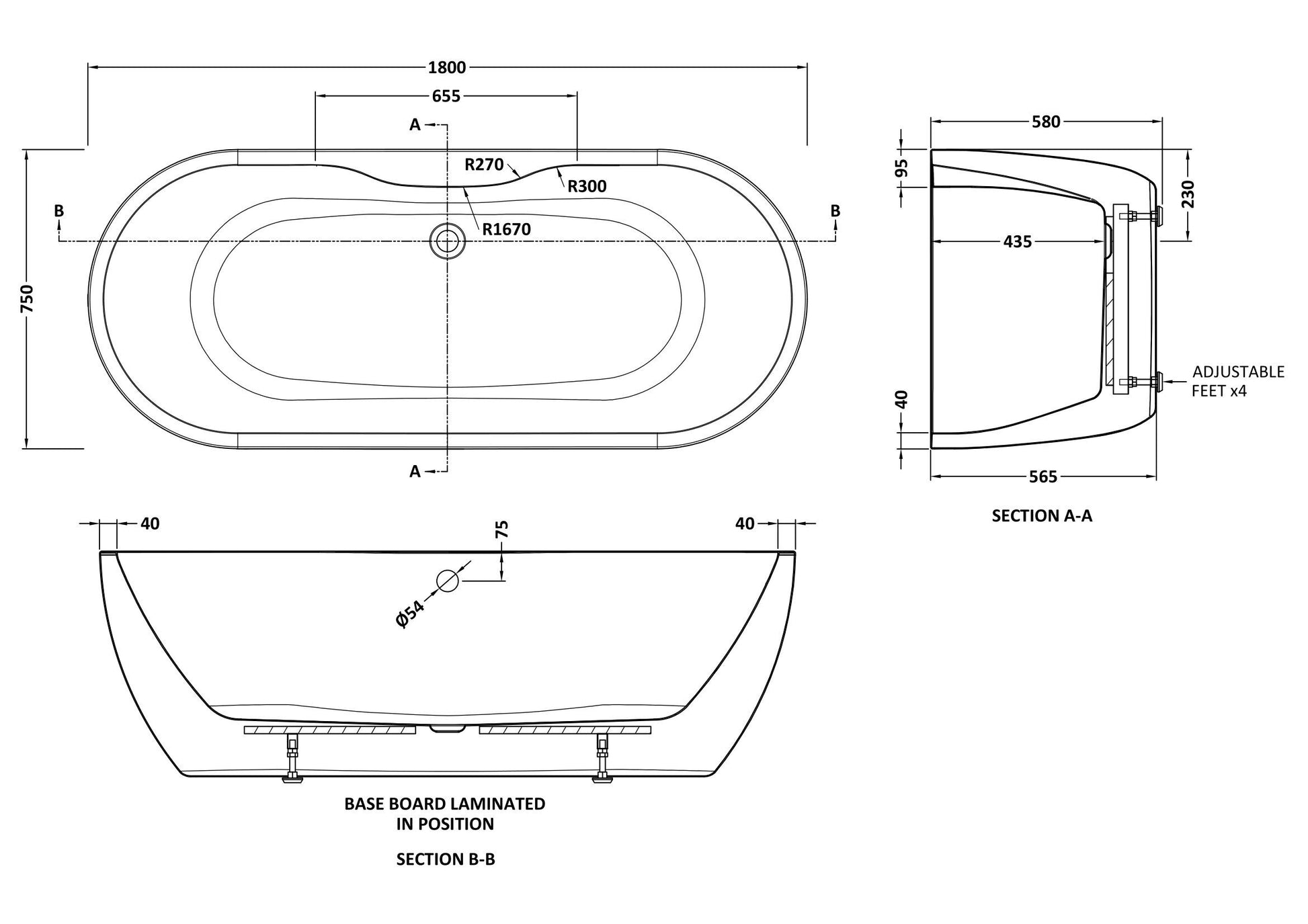 nuie choice Continuum Freestanding Boat Bath 1800 x 750 x 580 - White