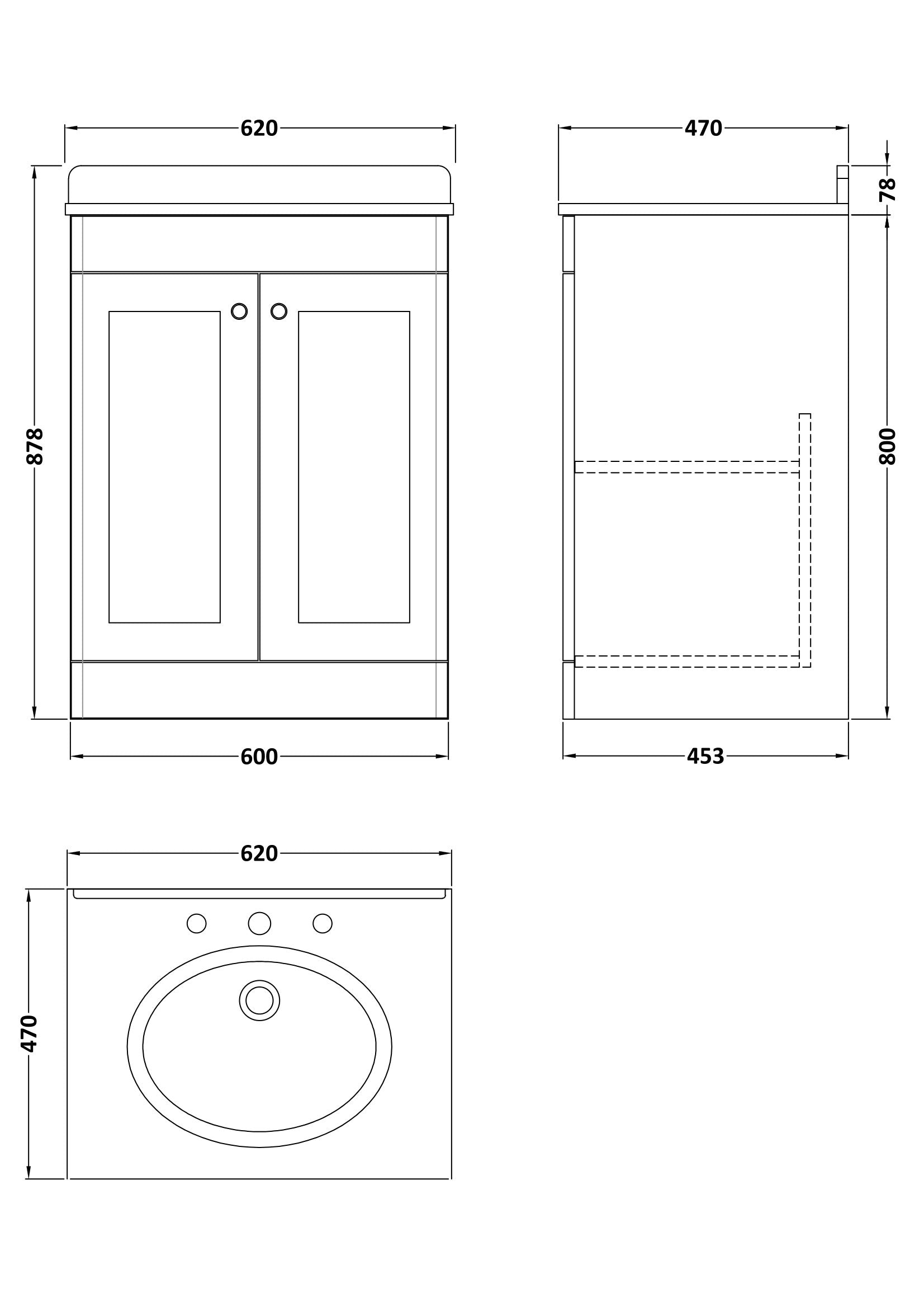Nuie Classique 600mm Satin Green Floor Standing 2 Door Vanity Unit with 3 Tap Hole Basin