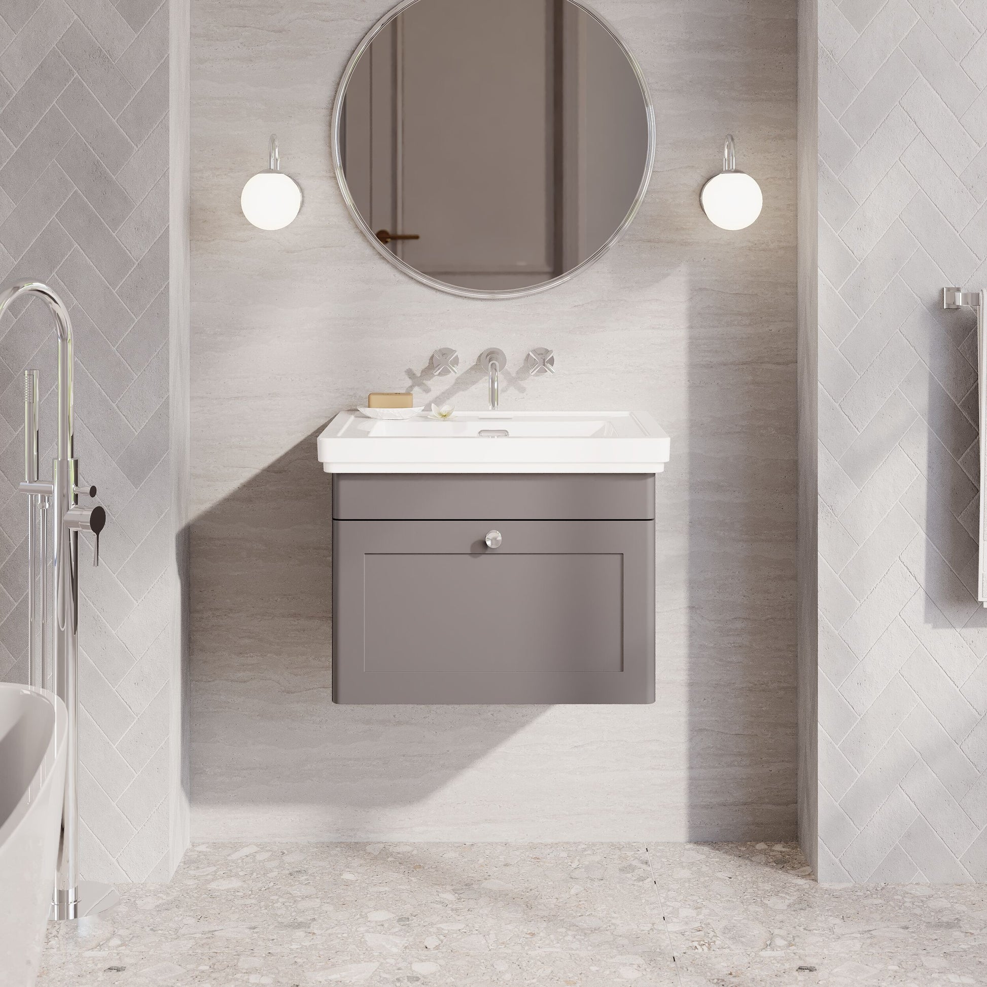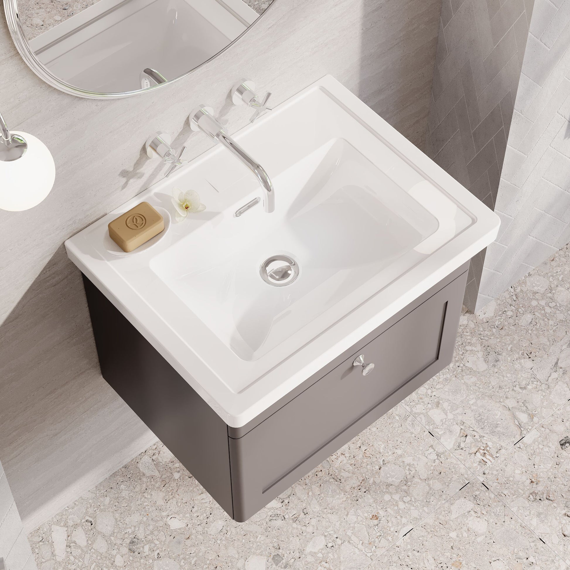 nuie Classique Wall Hung 1 Drawer Unit & 0 Tap Hole Fireclay Basin, 600mm - Satin Grey