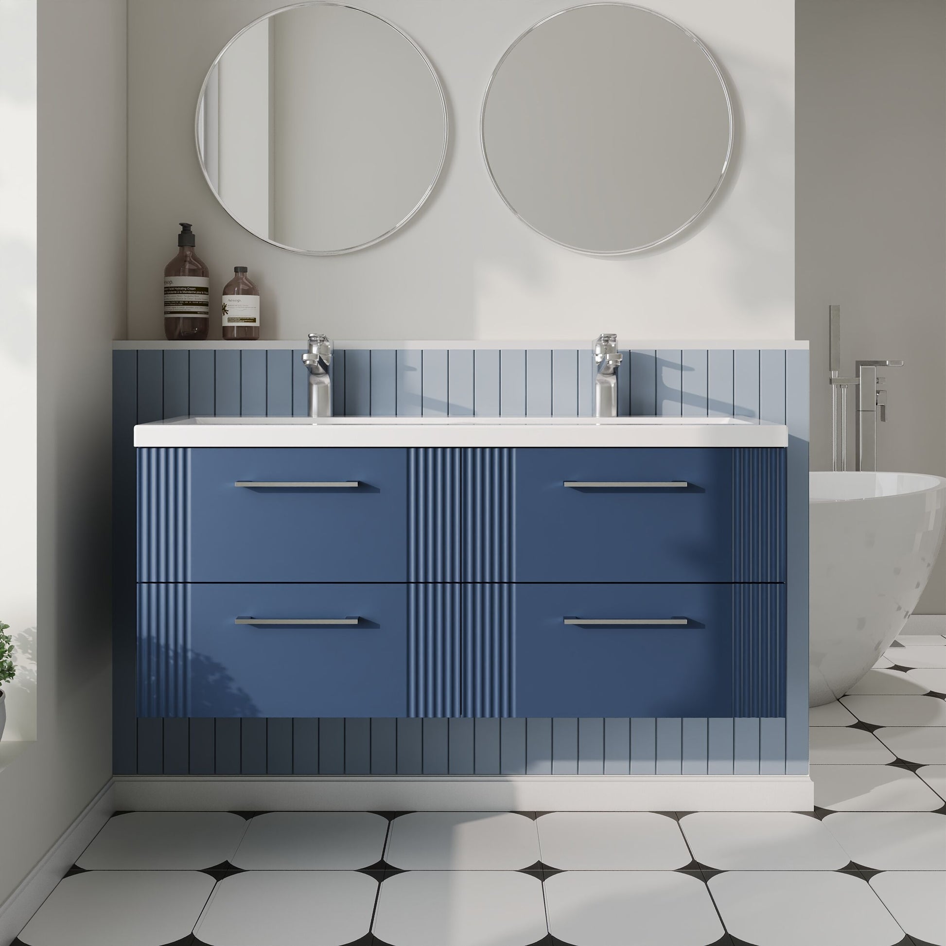 nuie Deco 1200mm Wall Hung 4-Drawer Vanity & Double Basin - Satin Blue