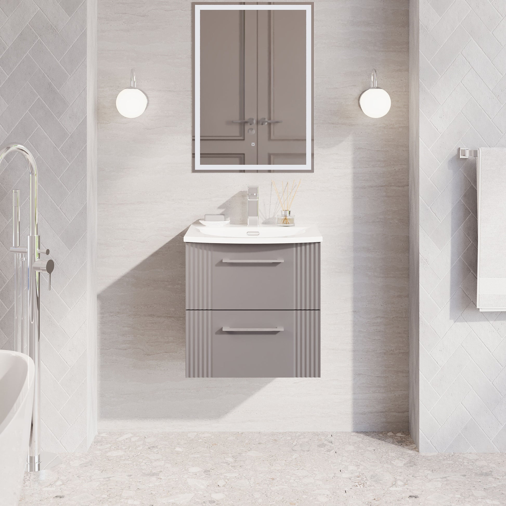 Nuie Deco 500mm Satin Grey Wall Hung 2-Drawer Vanity Unit with Curved Basin