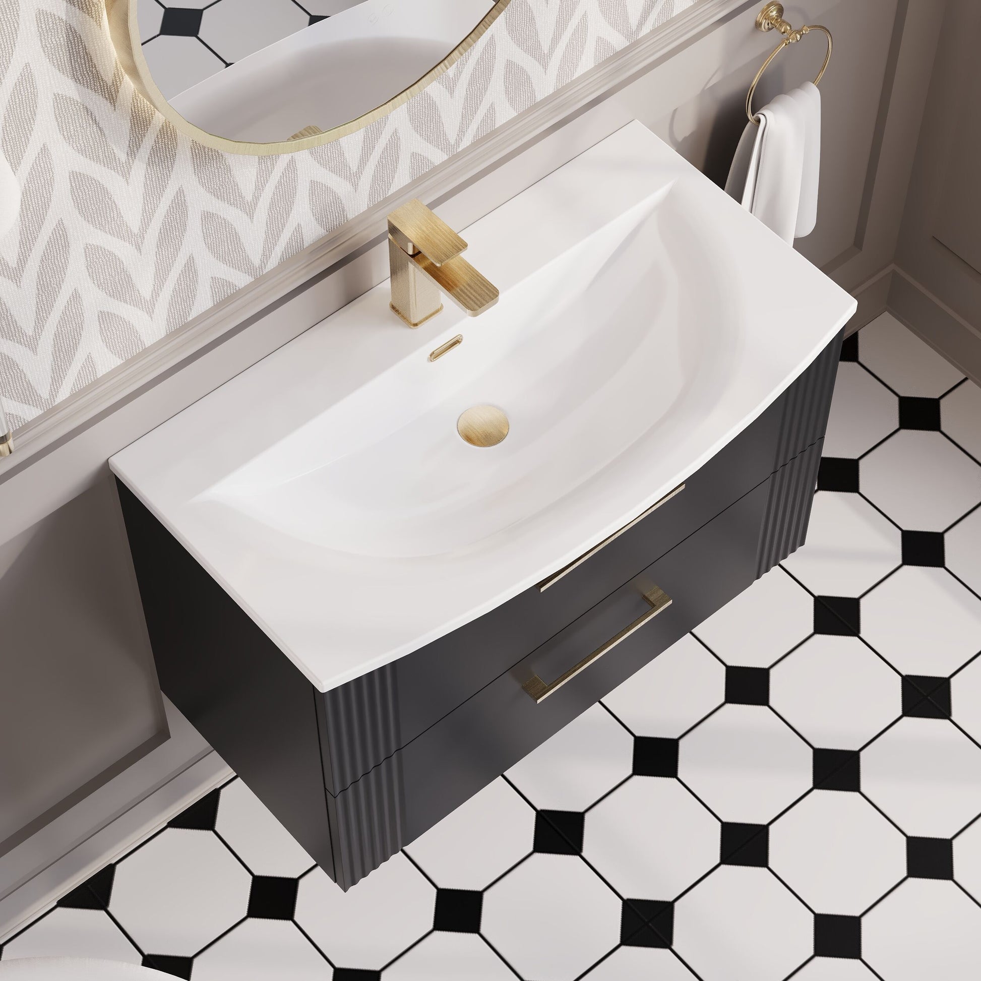 Nuie 800mm Soft Black Part Fluted Wall Hung 2-Drawer Vanity Unit & Curved Basin With Chrome Handles