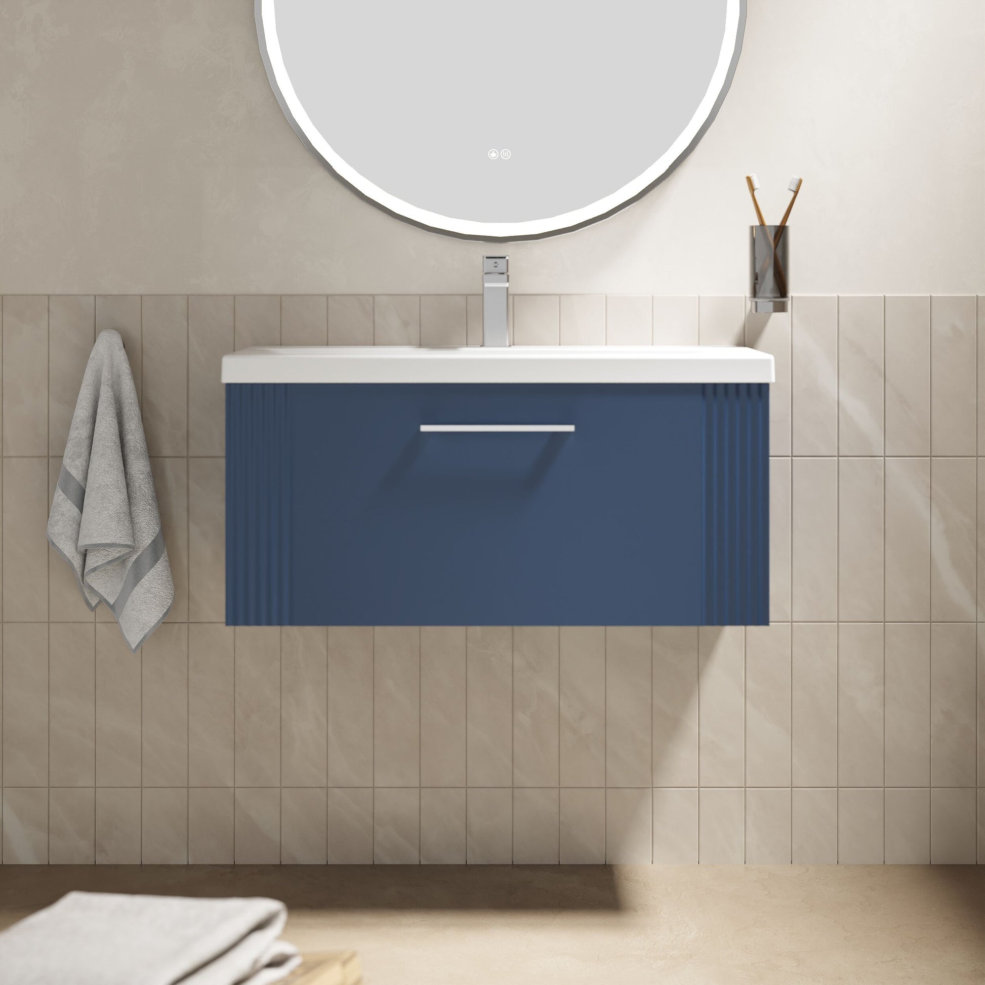 Nuie Deco 800mm Satin Blue Wall Hung Single Drawer Vanity Unit with Basin with Chrome Handle