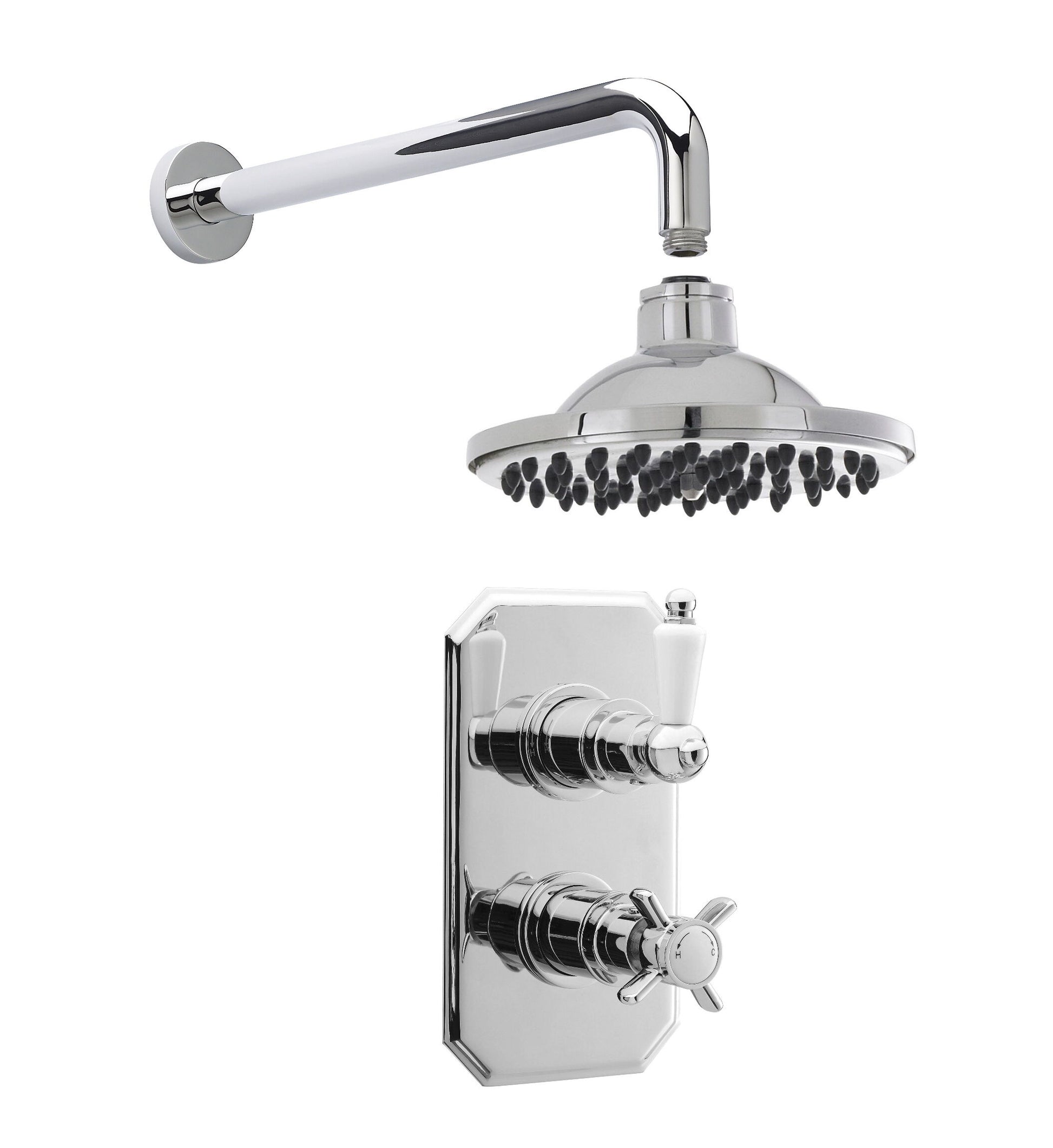 nuie Edwardian Traditional Thermostatic Concealed Twin Valve, Wall Mount Shower Arm and Round Fixed Head Shower Kit - Chrome/White