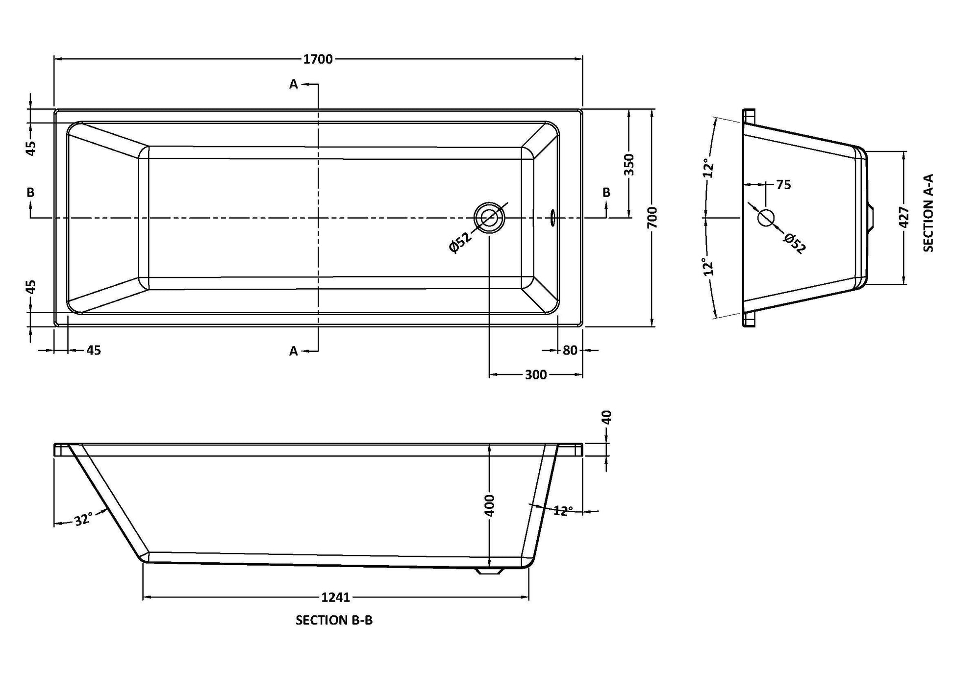 nuie Linton Square Thin Edge Single Ended Straight Shower Bath 1700mm x 700mm - White