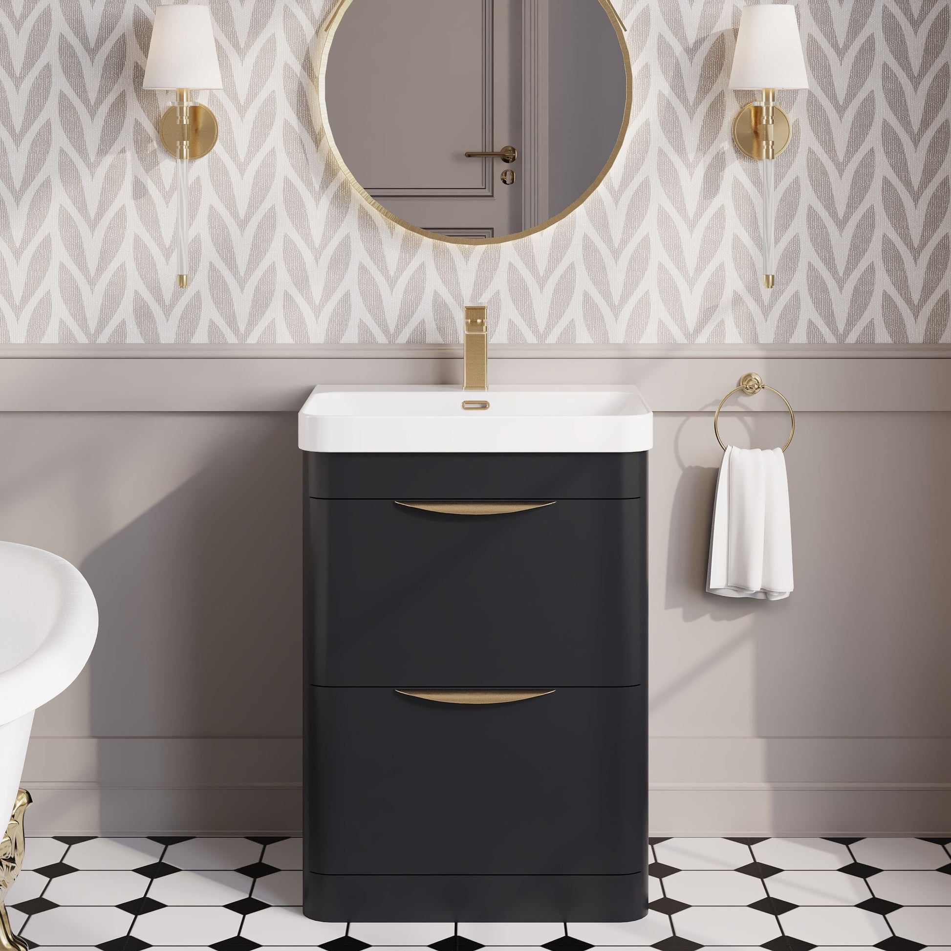 Nuie Parade 600mm Soft Black Floor Standing 2 Drawer Vanity Unit with 1 Tap Hole Ceramic Basin