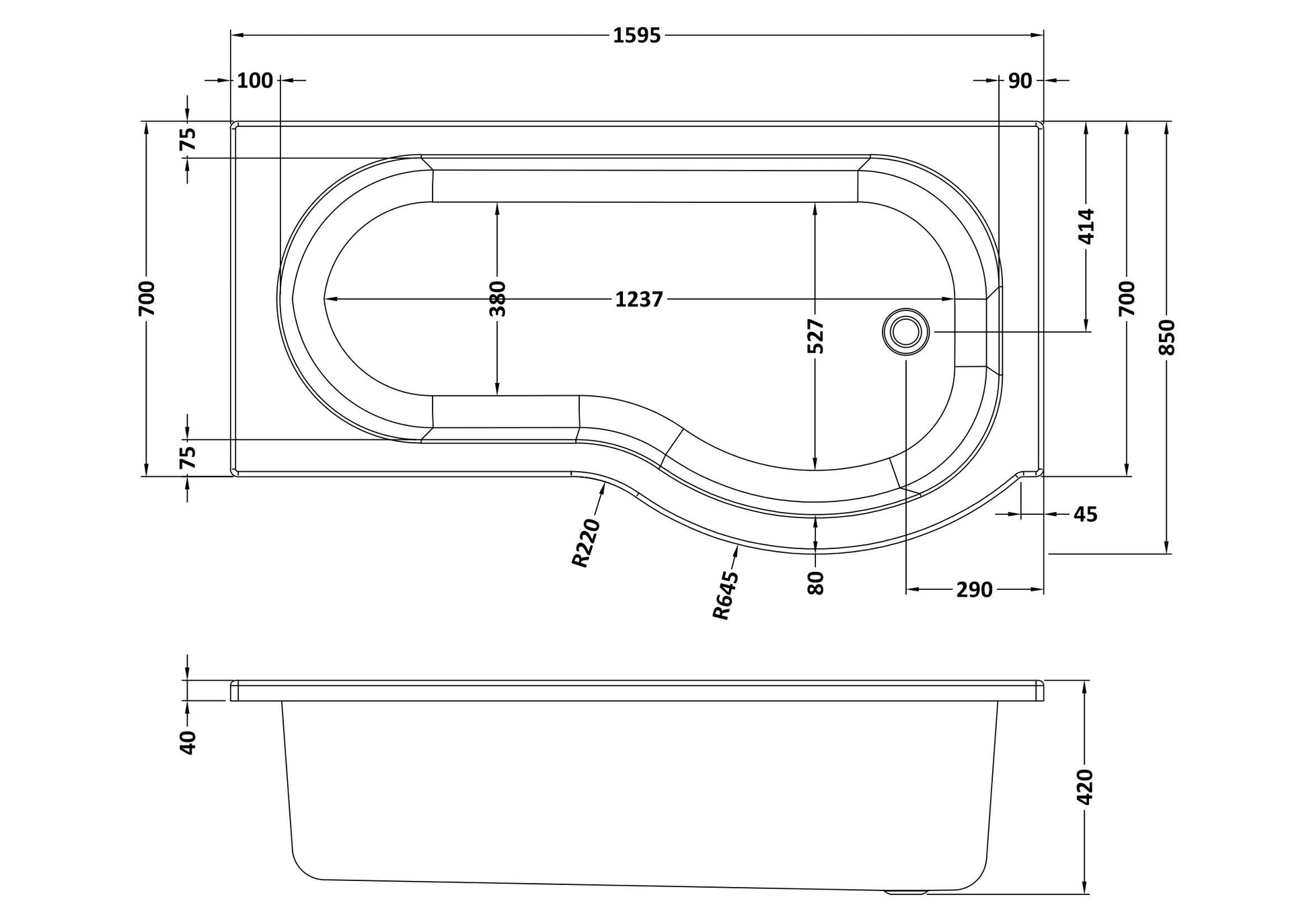 Nuie 1600mm Right-Hand P Shaped Shower Bath