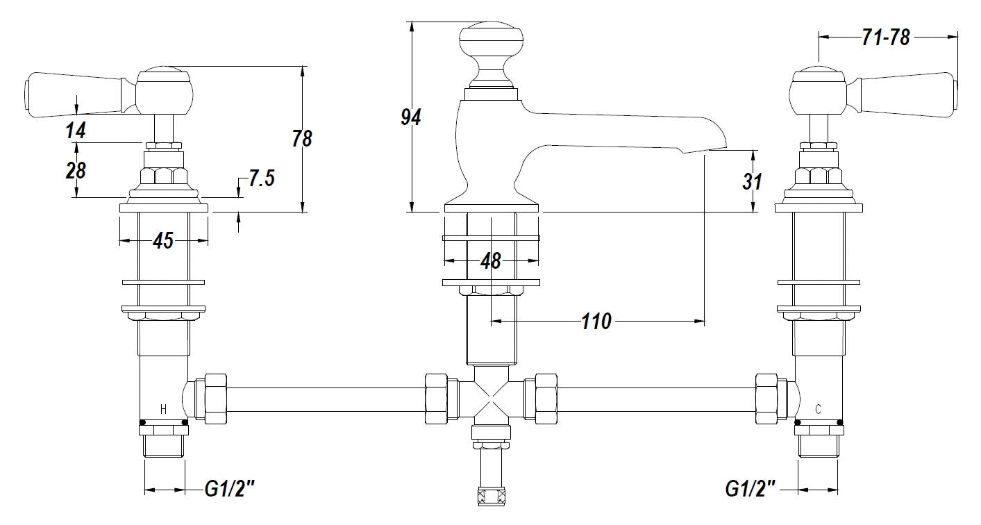 Old London White Topaz With Lever Handle 3 Tap Hole Basin Mixer - Chrome / White