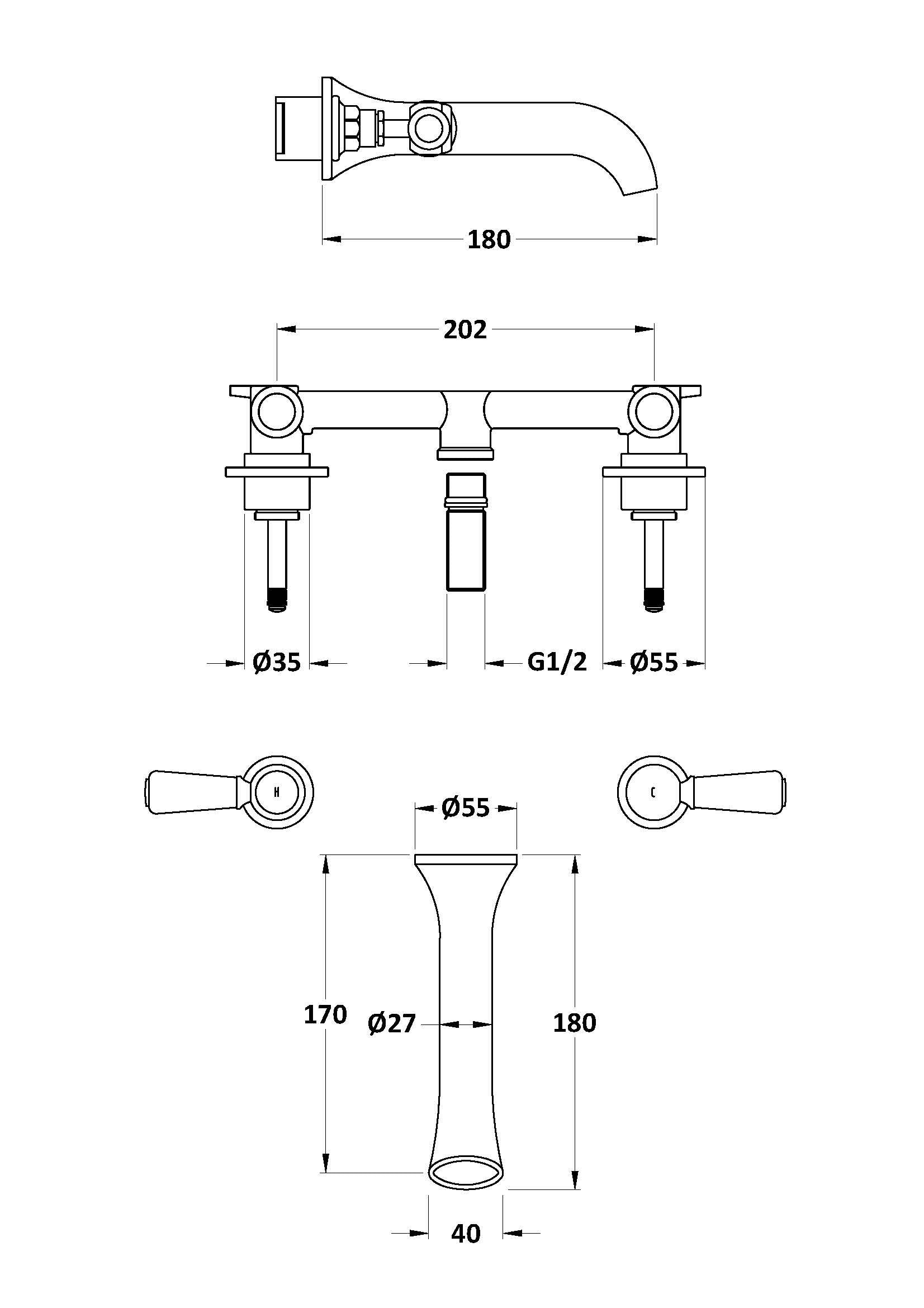 White Topaz With Lever Handle 3 Tap Hole Wall Mounted Basin Mixer